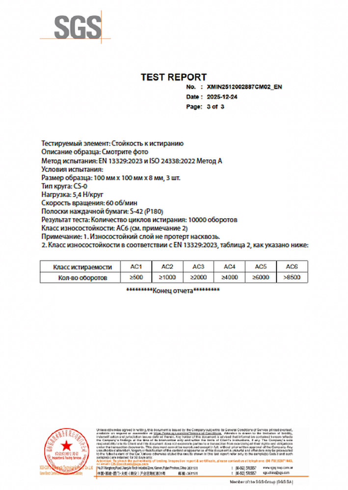 Испытание по EN 13329:2023: стальной шар 321 г падает с высоты 2000 мм — никаких видимых повреждений. Покрытие выдерживает интенсивные бытовые нагрузки